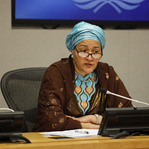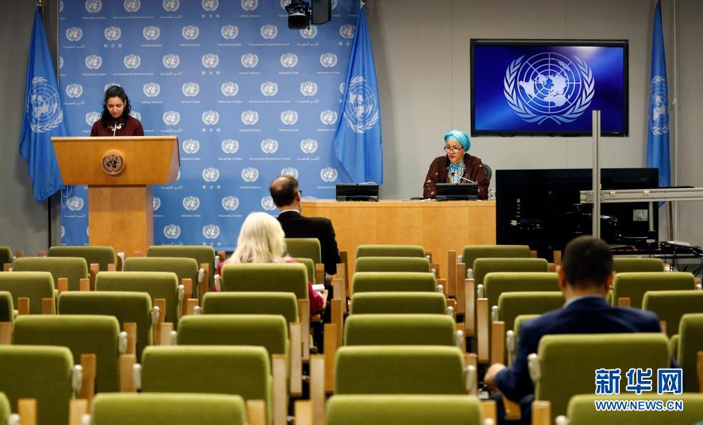 3月25日,联合国常务副秘书长阿明娜·穆罕默德(后右)在纽约联合国总部举行的记者会上发言。
