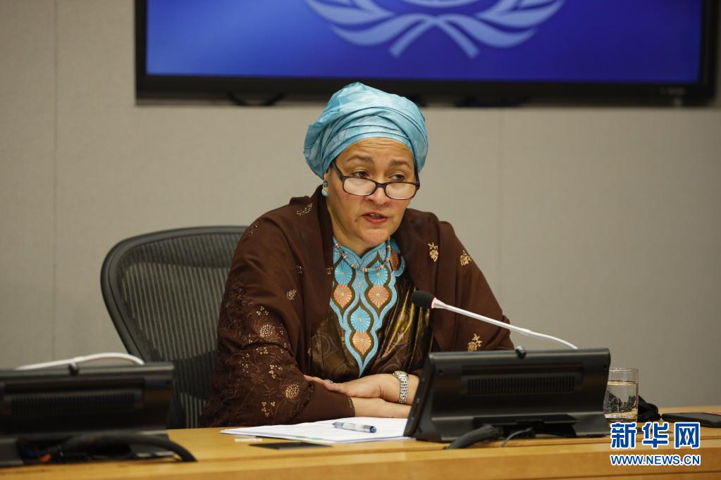 3月25日,联合国常务副秘书长阿明娜·穆罕默德在纽约联合国总部举行的记者会上发言。
