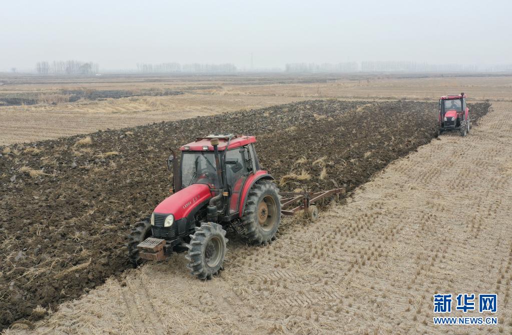 3月26日,唐山市曹妃甸区第九农场的农民使用机械设备深耕稻田(无人机照片)。