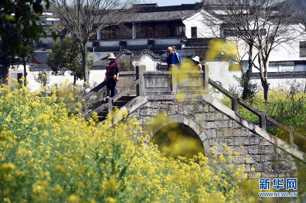 3月26日,游客在安徽省黄山市徽州区呈坎古村踏青游览。