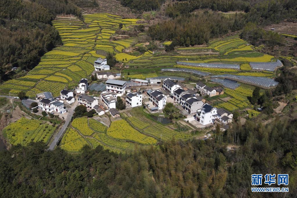 这是3月26日拍摄的花海中的黄山市徽州区灵山村(无人机照片)。