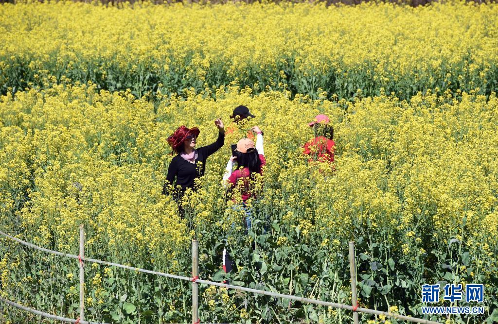 3月26日,游客在黄山市徽州区灵山村的花海中踏青游览。