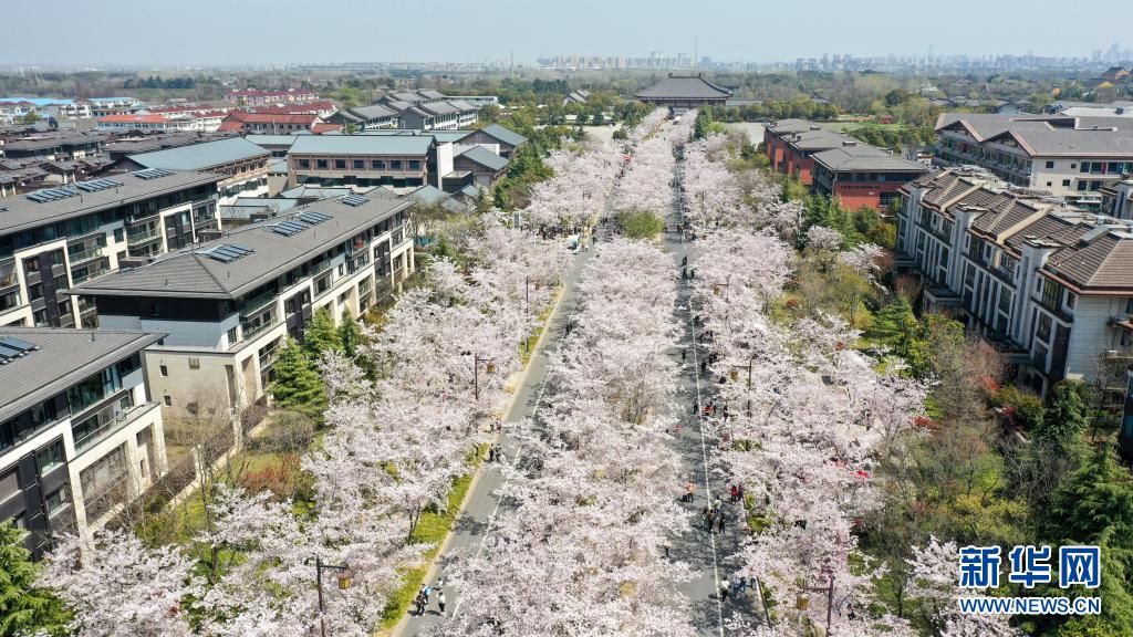 3月26日拍摄的江苏省扬州市鉴真路“樱花大道”(无人机照片)。