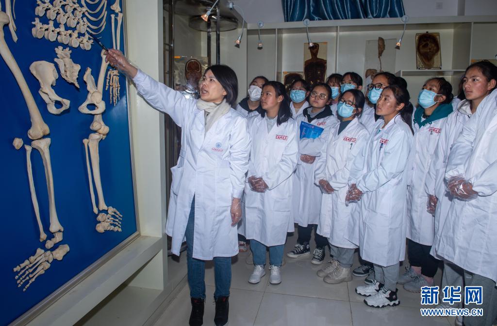 西藏藏医药大学藏医系现代医学教研室宗咏花老师在讲解人体骨骼构造(3月23日摄)。