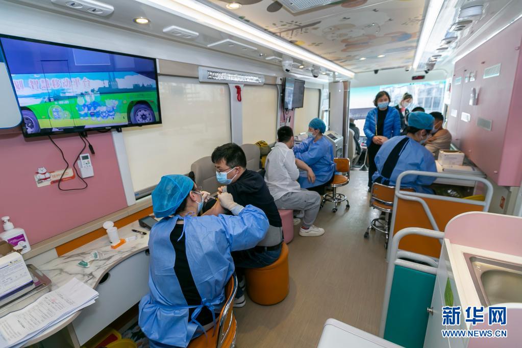 3月26日,企业员工在移动预防接种车上接种疫苗。新华社记者 王翔 摄