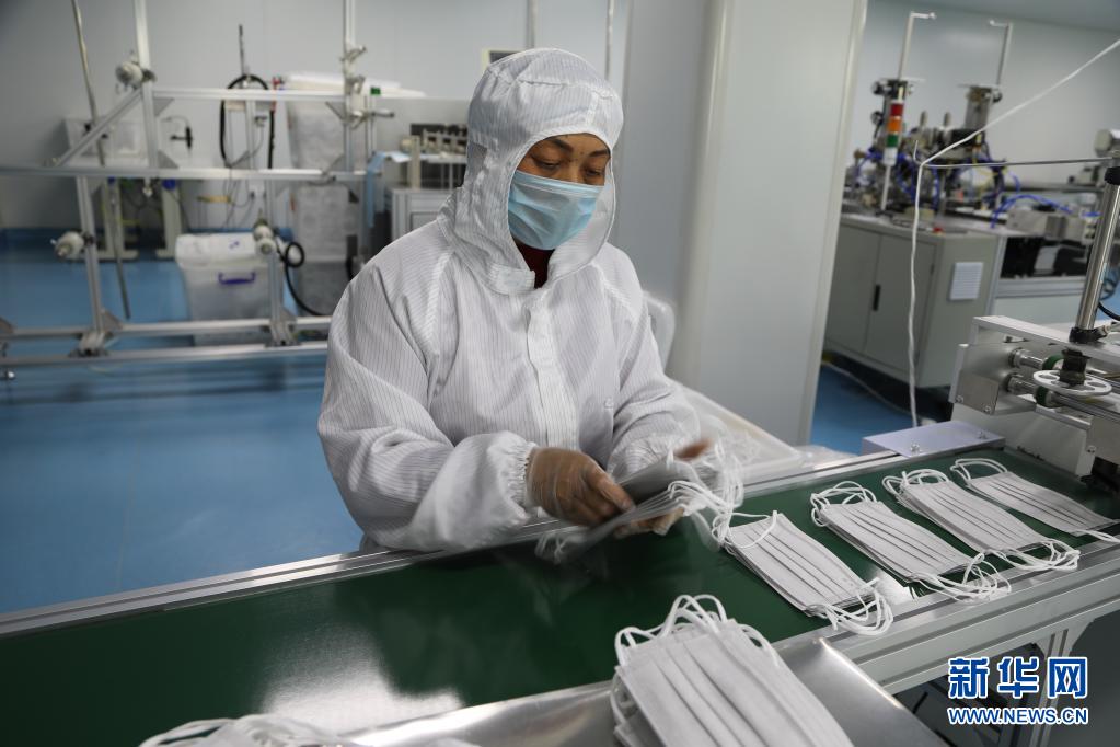 3月26日,在甘肃省临夏市南龙镇马家庄村的甘肃阳光智家网络科技有限公司医用口罩生产车间内,工作人员在加工生产石墨烯口罩。