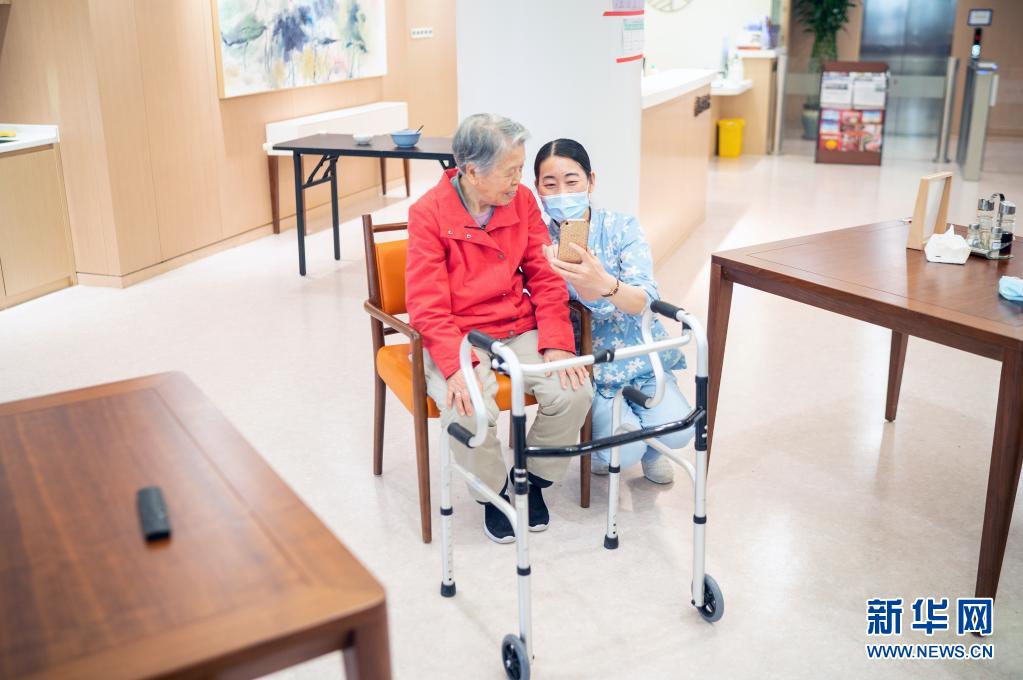 3月26日,在北京首厚大家朝阳养老社区,一名老人与工作人员自拍。