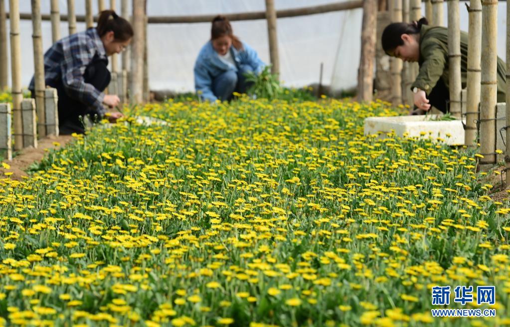 3月26日在黄骅市滕庄子镇夏庄子村野菜种植基地拍摄的在大棚人工种植的蒲公英。