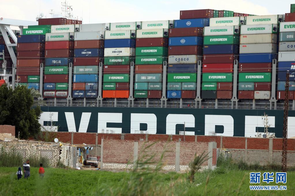 这是3月26日拍摄的搁浅在埃及苏伊士运河上的重型货船。新华社发(艾哈迈德·戈马 摄)