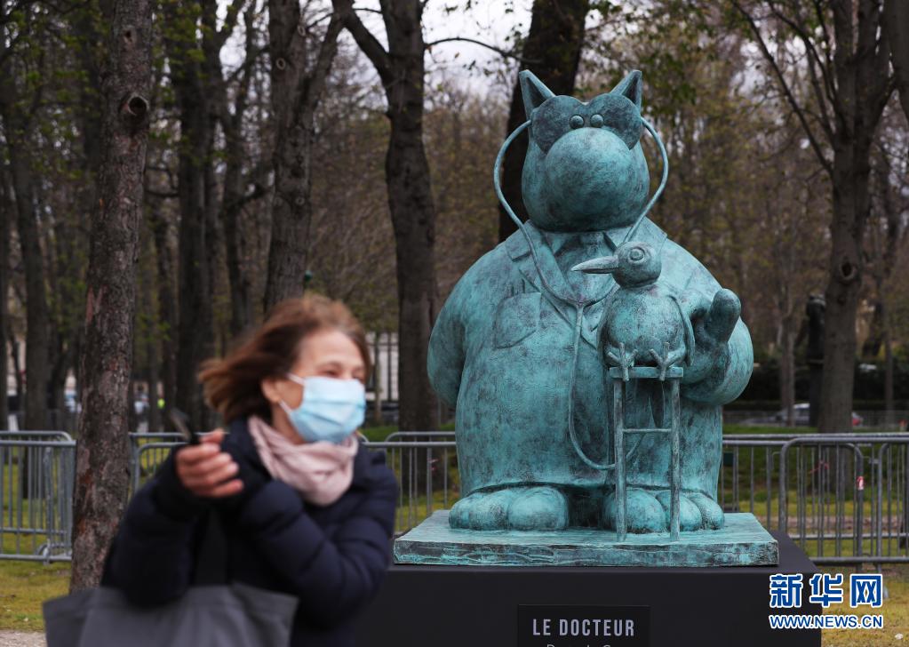3月26日,一名路人走过法国巴黎香榭丽舍大街上的一尊“猫先生”铜像。新华社记者 高静 摄