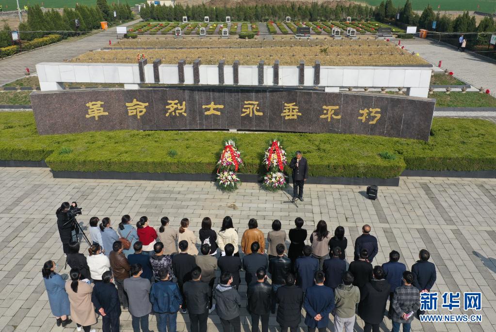 3月25日,在五条岭烈士陵园,卞康全在给瞻仰者讲述英烈当年的战斗故事(无人机照片)。新华社记者 季春鹏 摄