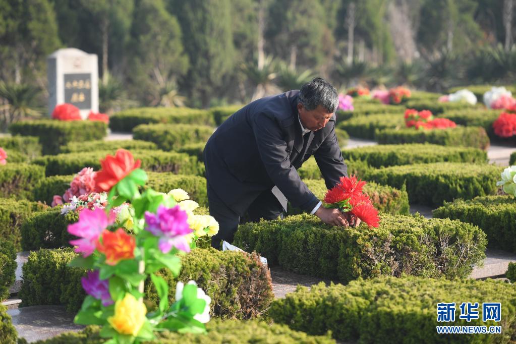 3月25日,在五条岭烈士陵园,卞康全在墓碑前维护整理。新华社记者 季春鹏 摄