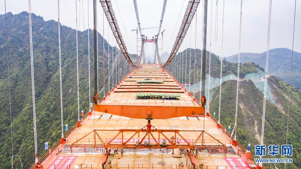 3月27日,工人在贵黄高速公路阳宝山特大桥上施工(无人机照片)。 新华社记者 陶亮 摄