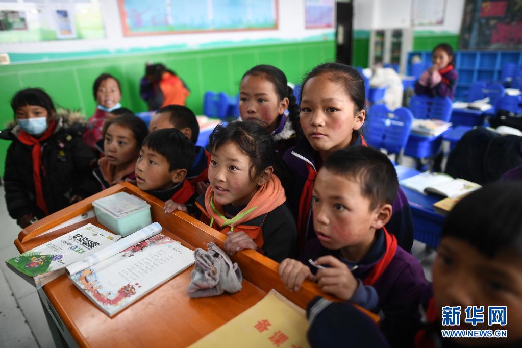 3月26日,青海玛多县民族寄宿制中学二年级学生在课间观看多媒体课件。该校目前采用清洁取暖方式,学生的学习和生活环境大为改善。