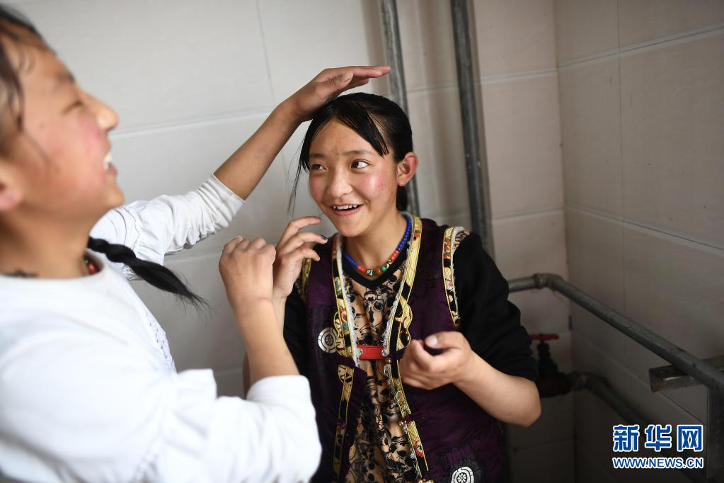 3月26日,青海玛多县民族寄宿制中学学生西毛其(右)和同学在宿舍洗漱间内。该校目前采用清洁取暖方式,学生的学习和生活环境大为改善。