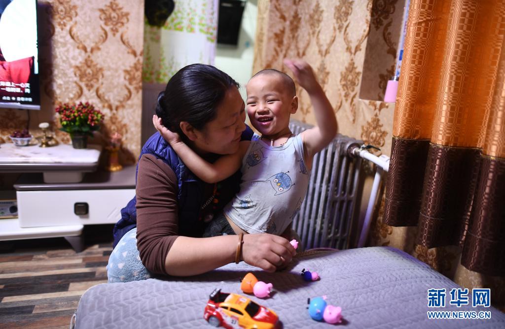 3月25日,在青海玛多县一小区内,牧民尕桑昂毛(左)陪孩子在家中玩耍。该小区目前采用清洁取暖方式,居民的生活环境大为改善。