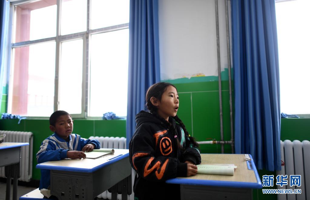 3月26日,青海玛多县民族寄宿制中学一年级学生美朵拉泽(右)在课堂上。该校目前采用清洁取暖方式,学生的学习和生活环境大为改善。