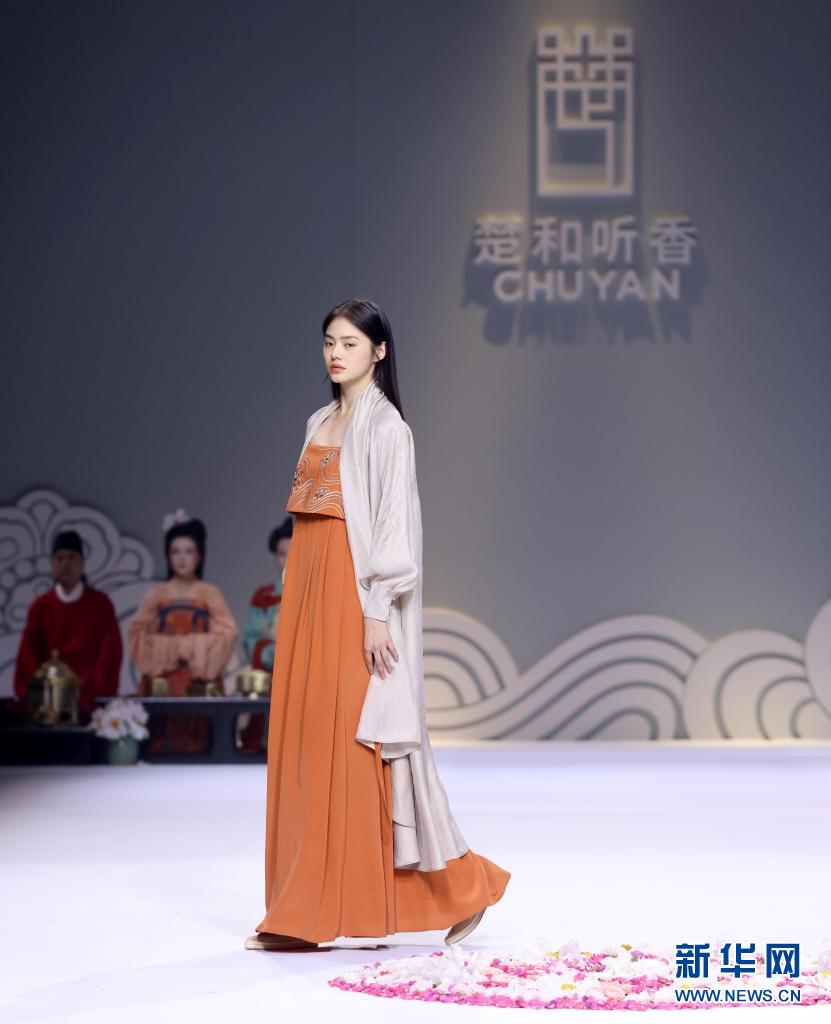 3月27日,模特在北京举行的2021秋冬中国国际时装周“楚和听香·问茶”时装发布上,展示时装设计师楚艳设计的时装。