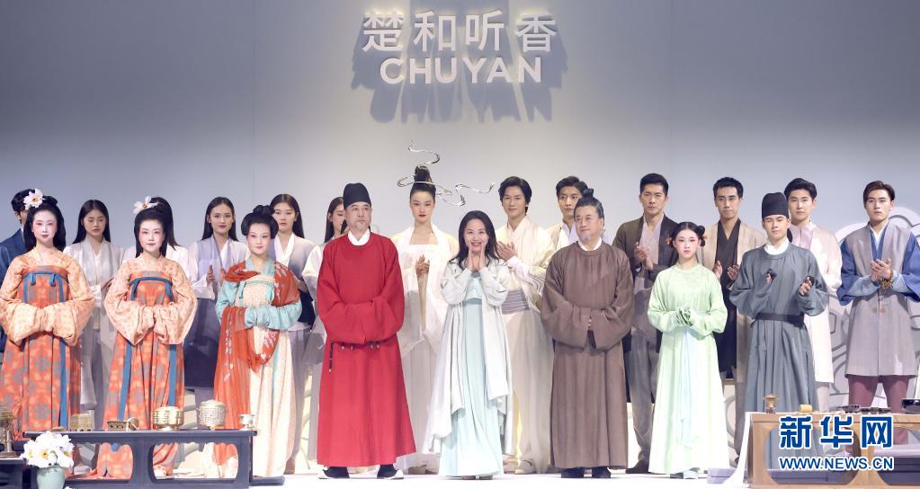 3月27日,设计师楚艳(前排右四)和模特在北京举行的2021秋冬中国国际时装周“楚和听香·问茶”时装发布上谢幕。