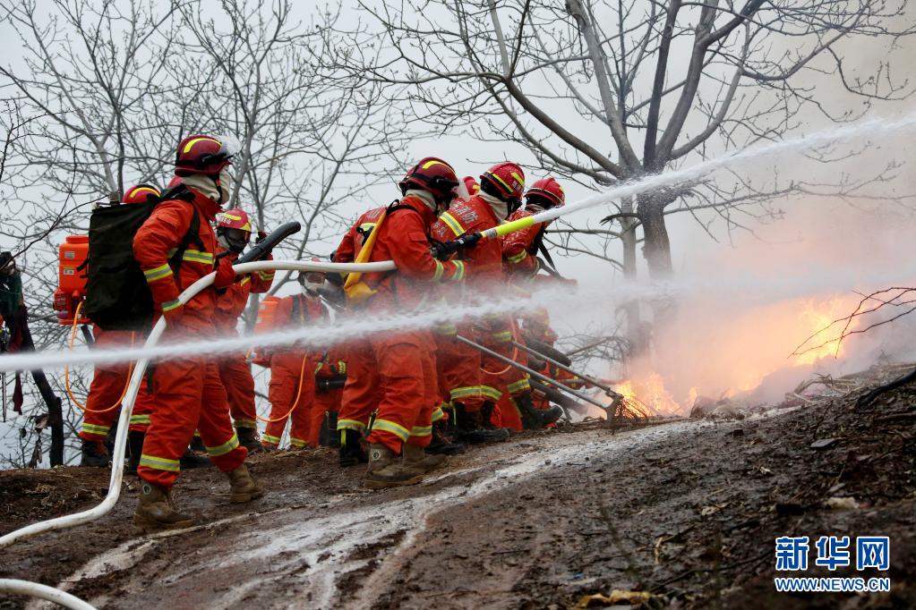 3月26日,森林消防专业人员在枣庄市市中区森林区域进行灭火实战演练。
