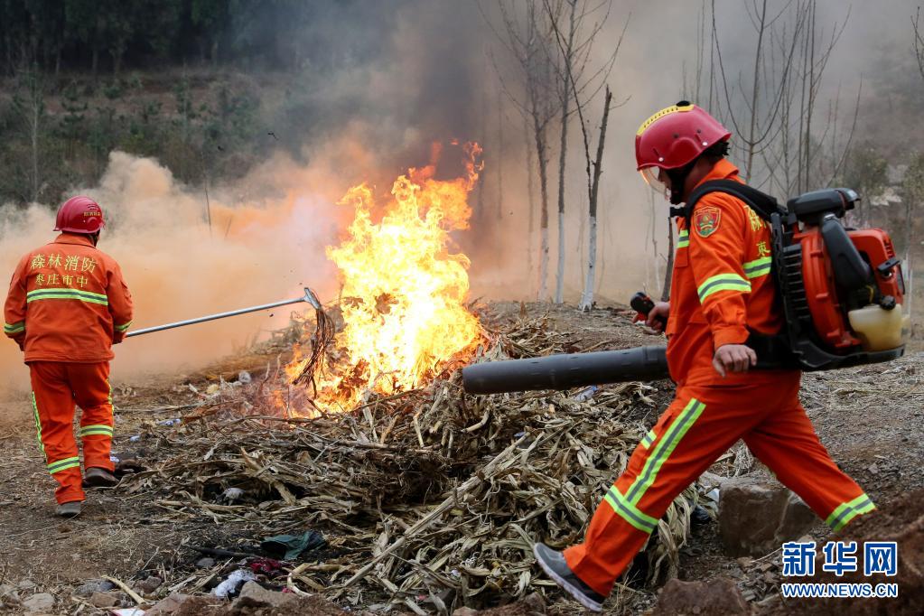 3月26日,森林消防专业人员在枣庄市市中区森林区域进行灭火实战演练。