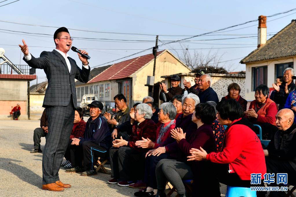 3月27日,在乳山市崖子镇北寨村,乳山市吕剧团的演员在为村民表演节目。