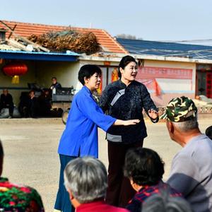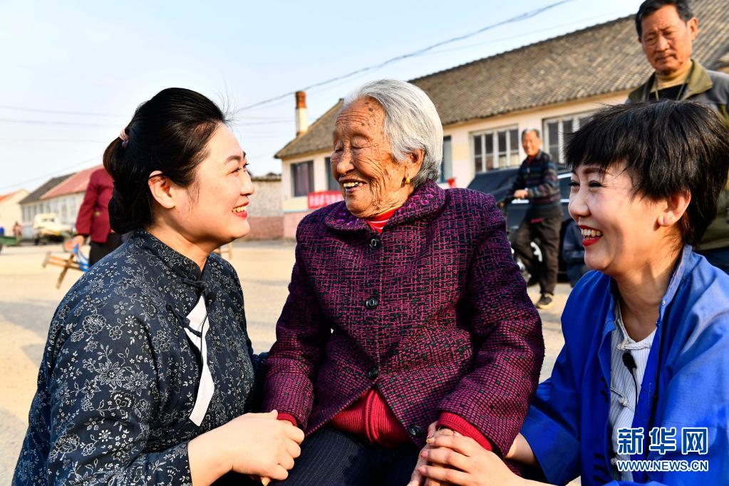 3月27日,在乳山市崖子镇北寨村,乳山市吕剧团红色吕剧《乳娘》中的演员与94岁的乳娘王葵敏(中)交流。