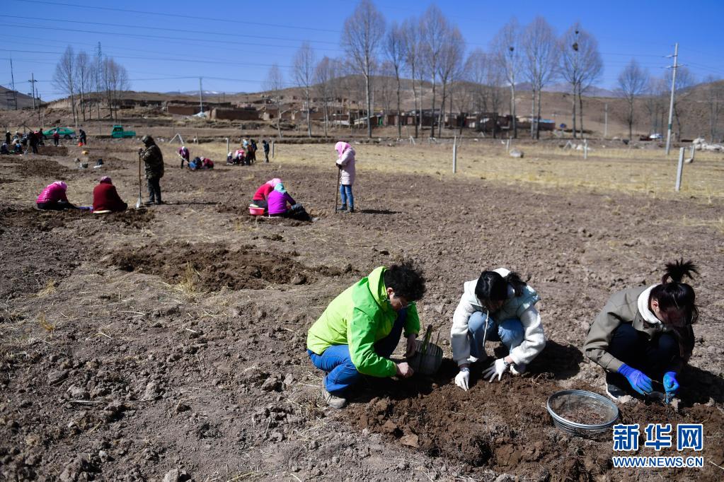 3月27日,青海民族大学生态环境与资源学院教授李军乔(前左一)带着学生在西宁市湟源县日月藏族乡牧场村采挖蕨麻。