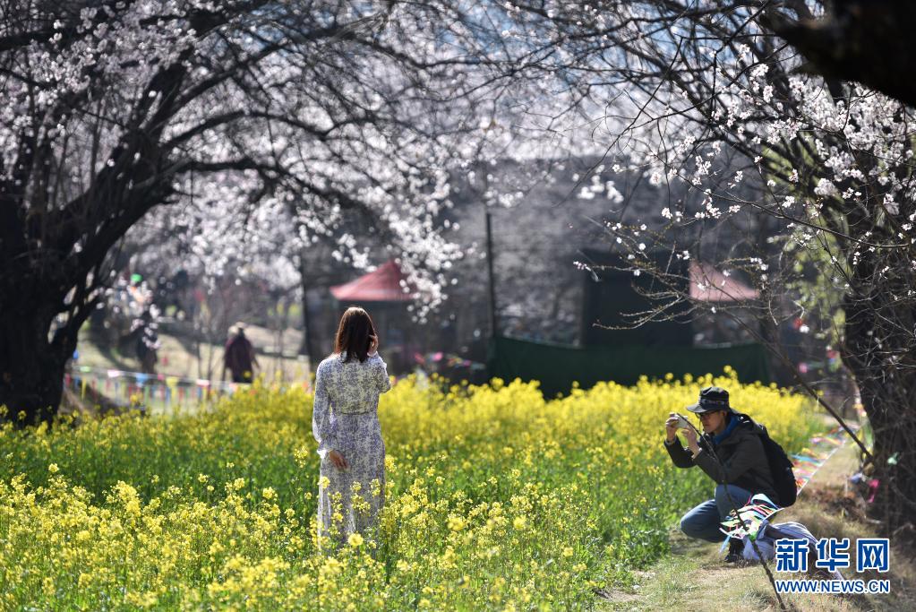 3月27日,游客在林芝市嘎拉村欣赏桃花时留影。