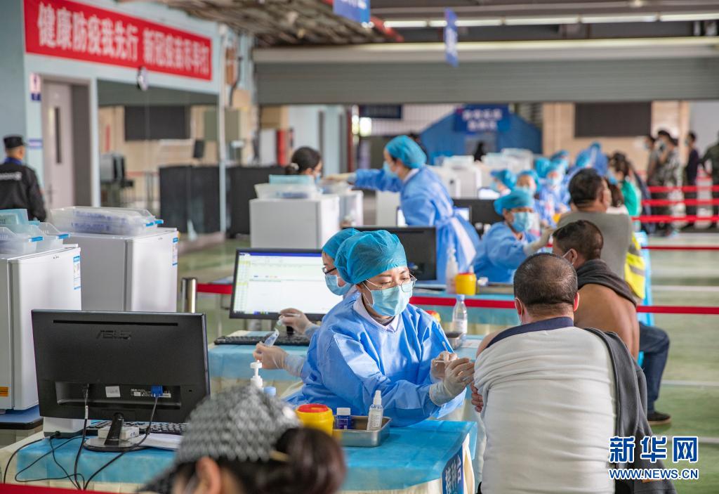 3月27日,在重庆市九龙坡区奥林匹克体育中心新冠疫苗临时集中接种点,医务人员为居民接种新冠疫苗。