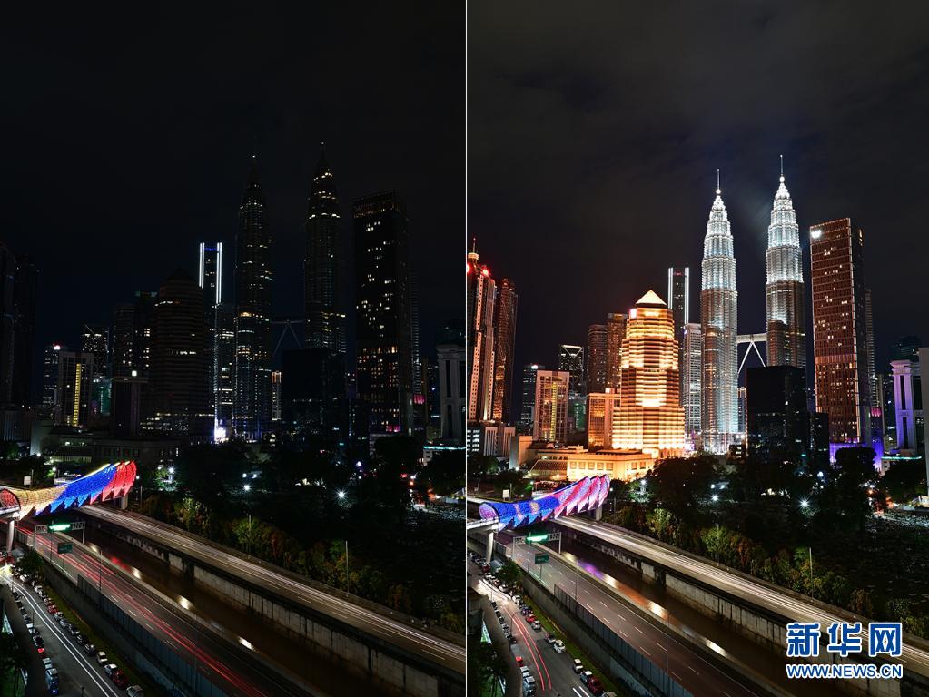 这张拼版照片显示的是,3月27日,在马来西亚吉隆坡,马来西亚国家石油公司双塔及周边建筑在“地球一小时”开始前后的景象。
