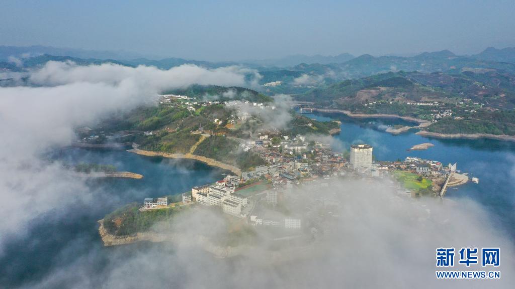 3月28日拍摄的云雾中的流水镇(无人机照片)。