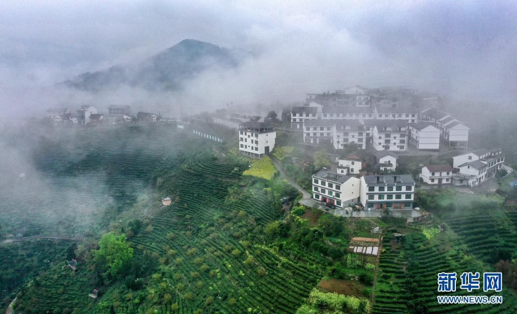 云雾中的流水镇万亩茶园(3月26日摄,无人机照片)。