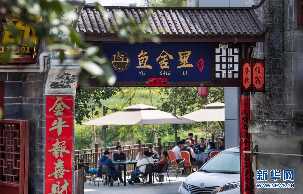 游人在流水镇的古街上体验农家乐(3月27日摄)。