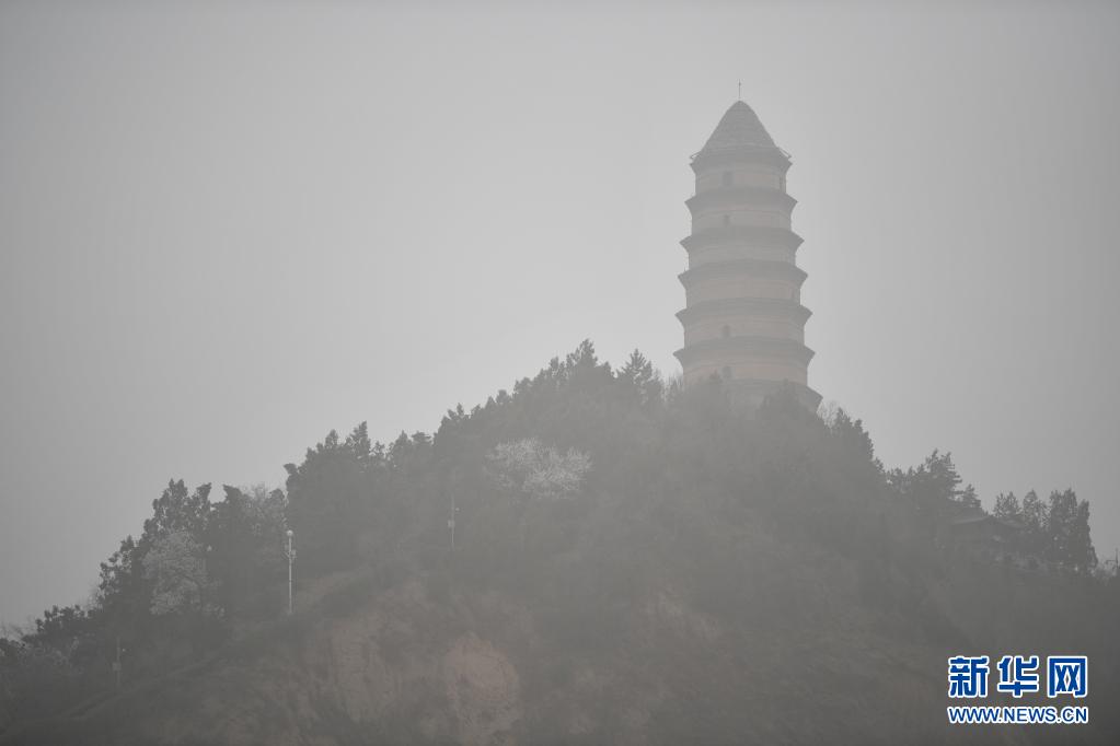 3月28日,延安市地标宝塔山笼罩在沙尘中。
