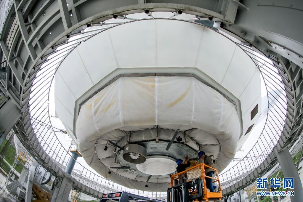 3月28日,工作人员对FAST馈源舱进行常规维护(鱼眼镜头拍摄)。