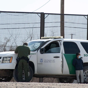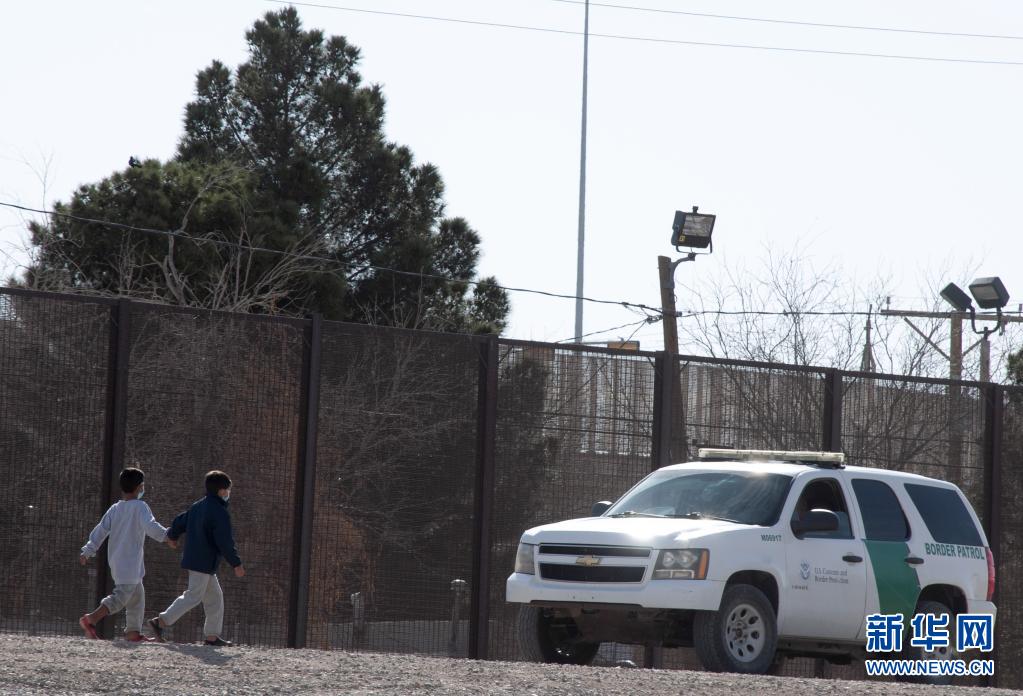 这张3月27日在墨西哥华雷斯拍摄的照片显示,两名来自危地马拉的移民儿童在跨越美墨边境的里奥格兰德河后,遇到美国边境巡逻队的执法车辆。