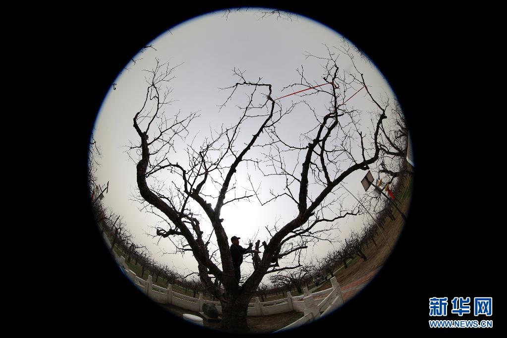 3月28日,枣农在黄骅市齐家务镇聚馆古贡枣园给冬枣树剪枝(鱼眼镜头拍摄)。
