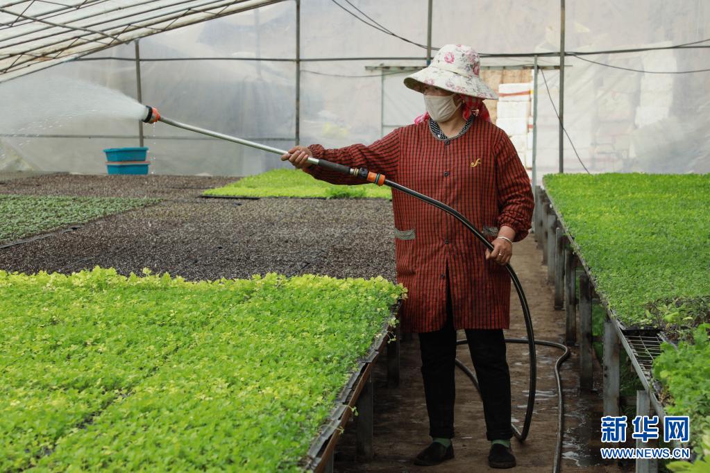 3月25日,位于青海省海西蒙古族藏族自治州都兰县香日德镇下柴源村的都兰柴源蔬菜种植专业合作社工作人员在浇灌蔬菜。新华社记者 王艳 摄
