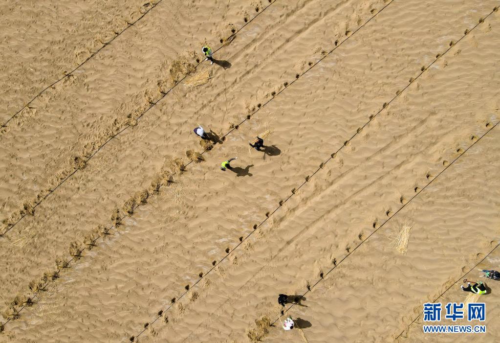3月28日,人们在且末县城不远处的塔克拉玛干沙漠内植树(无人机照片)。