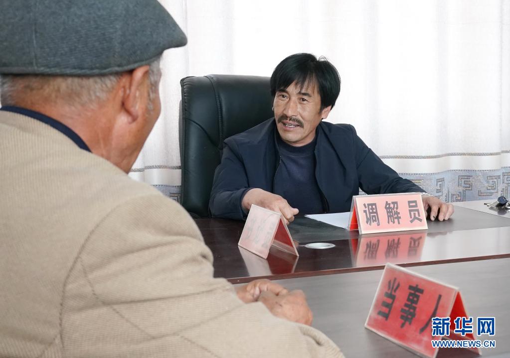 3月28日,在青龙满族自治县八道河乡沙河村法庭工作室,特邀调解员张玉三(右)调解一起土地纠纷。