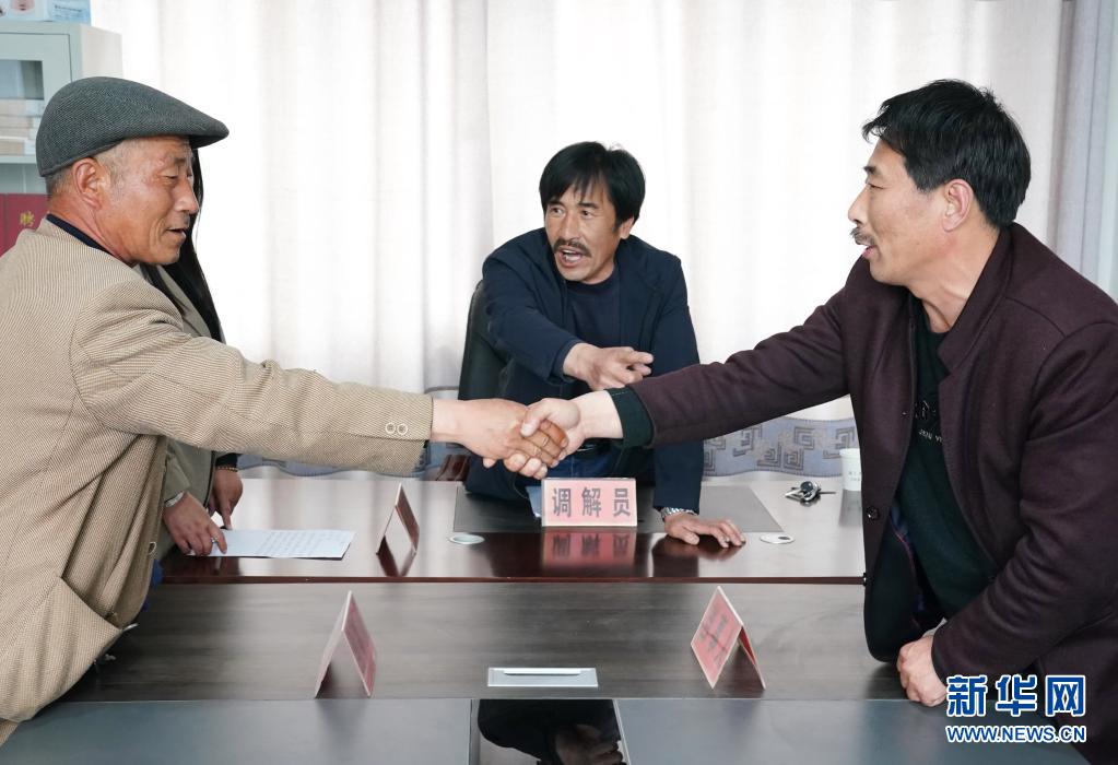 3月28日,在青龙满族自治县八道河乡沙河村法庭工作室,特邀调解员张玉三(中)调解一起土地纠纷。