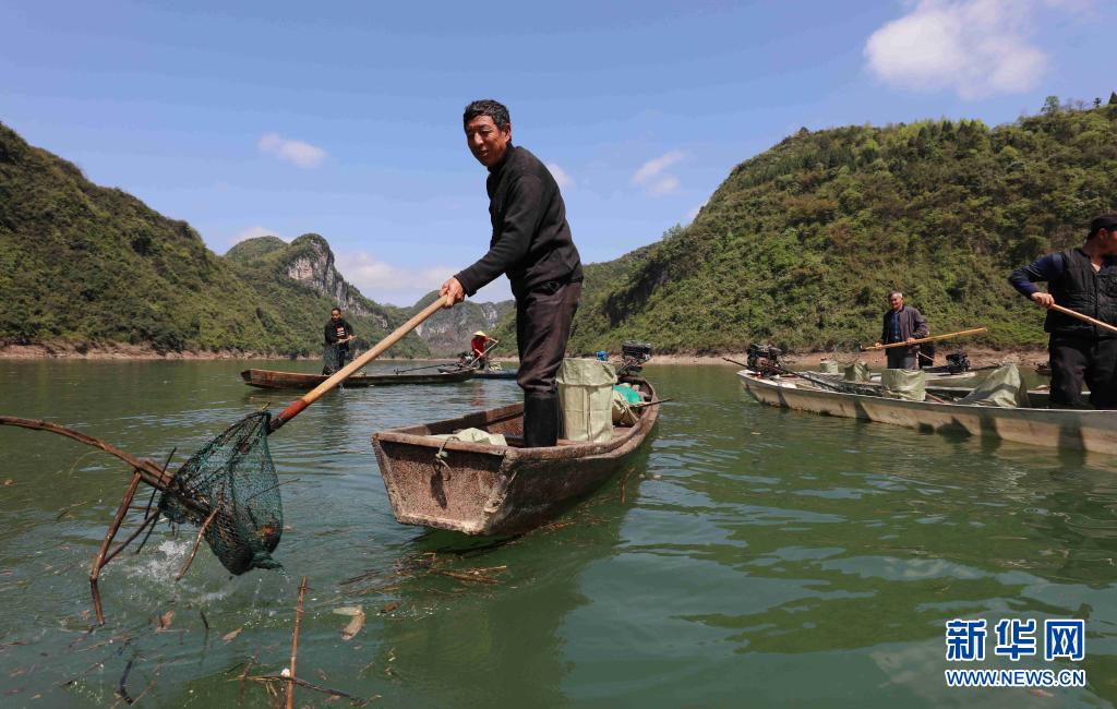 3月28日,在张家界茅岩河景区,当地村民驾船清理河道上的漂浮物。