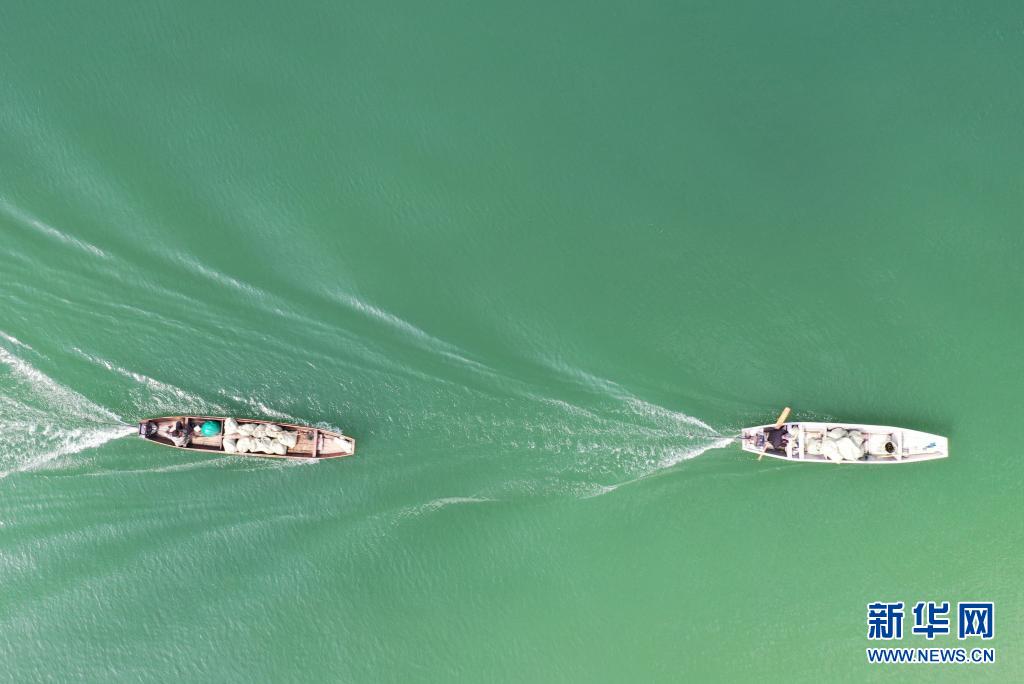 3月28日,在张家界茅岩河景区,当地村民驾船运输清理的漂浮物(无人机照片)。
