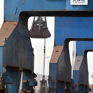 3月28日,在天津港南疆码头,工程车辆和起重机对固体废物进行装船作业。