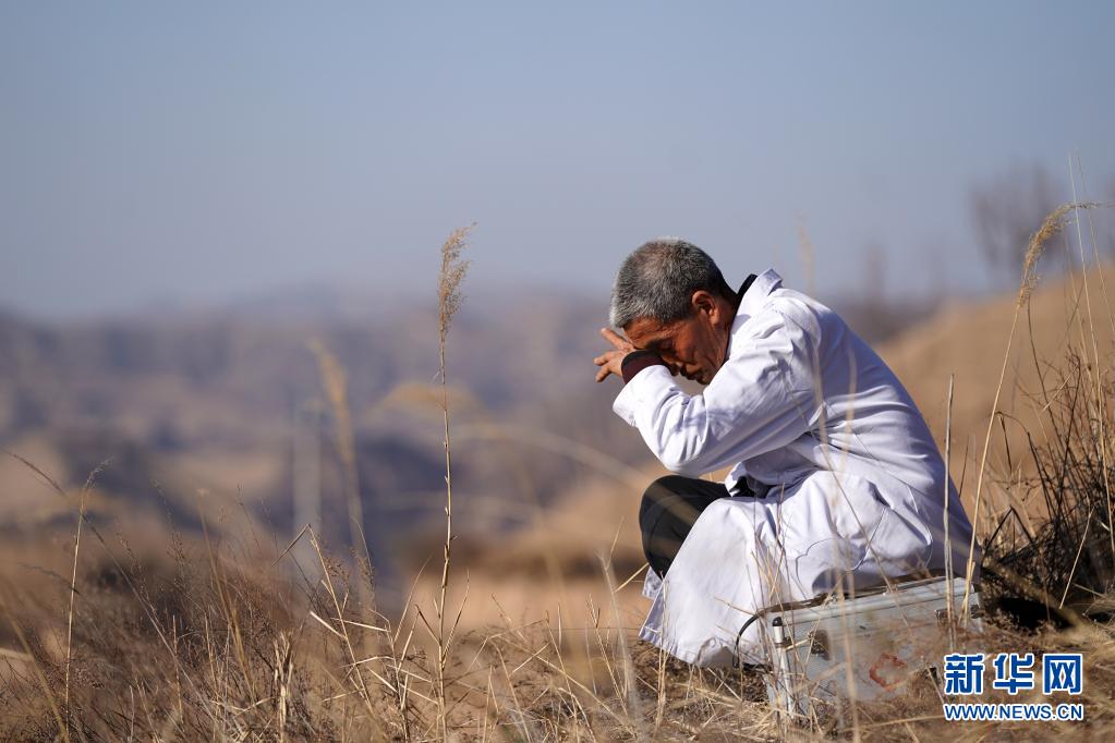 去石楼县铁头村张家湾自然村出诊途中,村医张尚保在路边擦汗休息(3月23日摄)。新华社记者 詹彦 摄