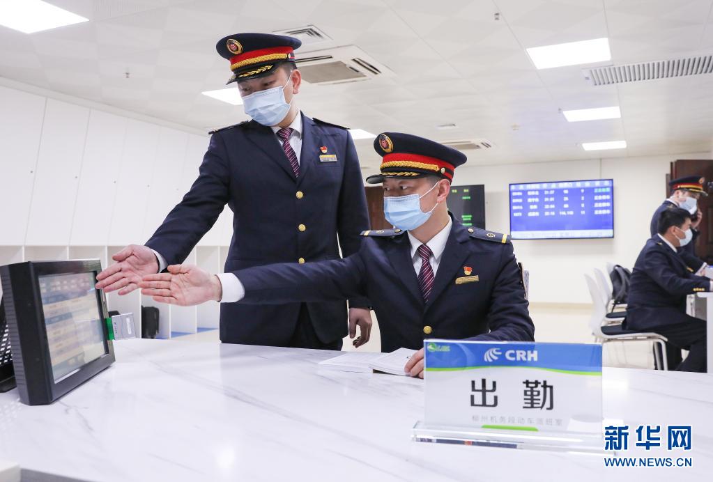 今年42岁的火车司机林斌(左)和徒弟丁志中在值班时共同确认监控数据(2月3日摄)。新华社发(江晓 摄)