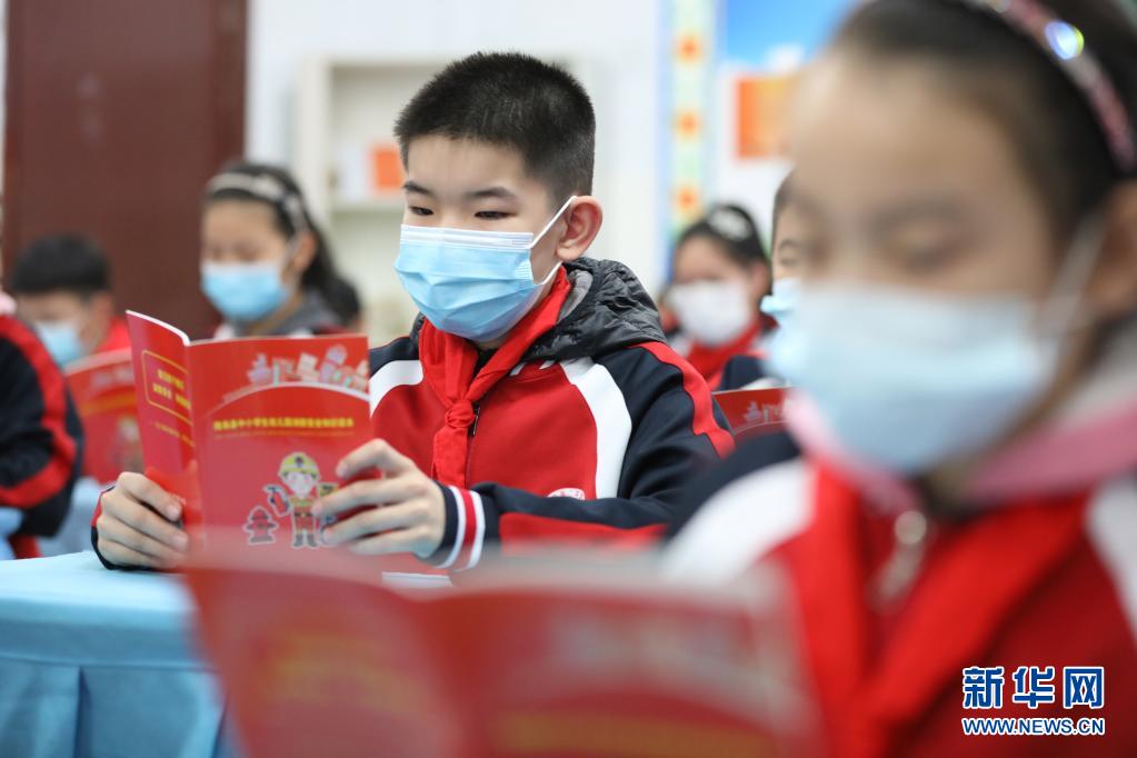 3月29日,在河北省邢台市隆尧县第二实验小学,学生在阅读消防安全知识手册。