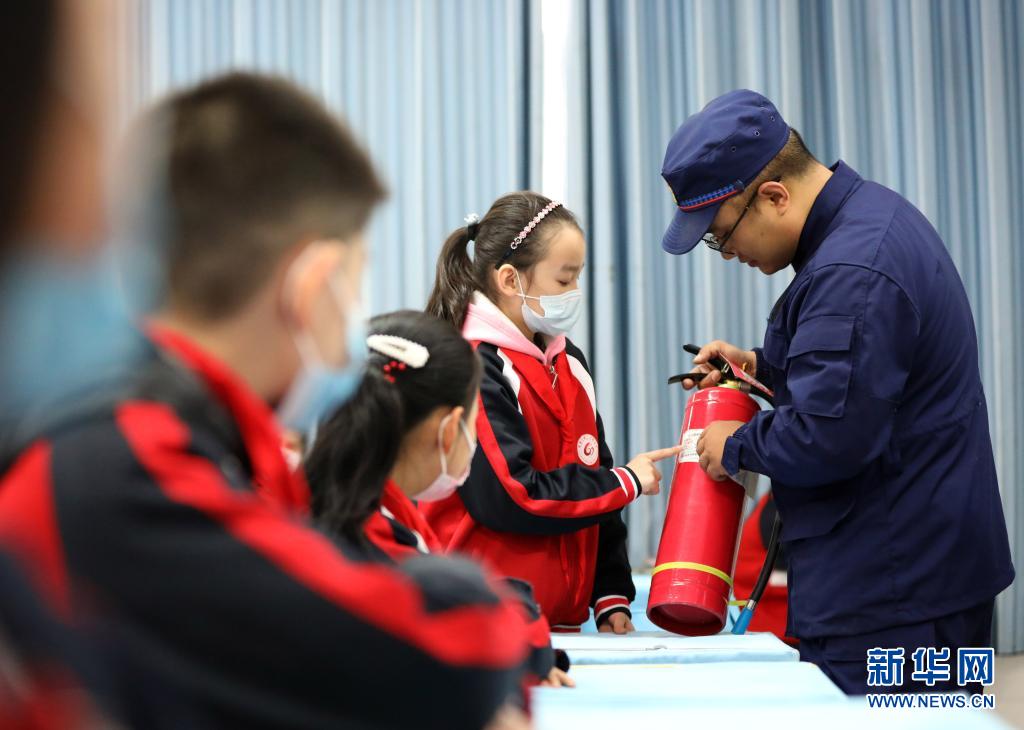 3月29日,在河北省邢台市隆尧县第二实验小学,消防员为学生讲解消防安全设备使用知识。