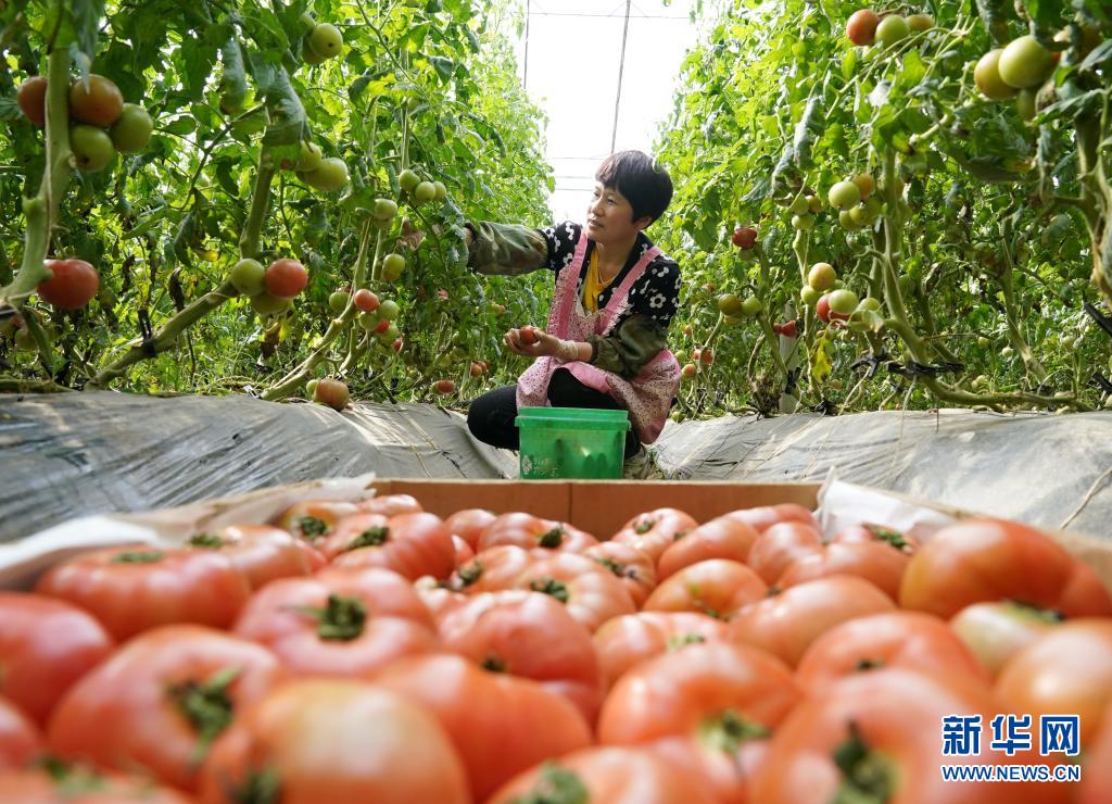 3月29日,秦皇岛市抚宁区食正源蔬菜种植专业合作社社员在采摘西红柿。